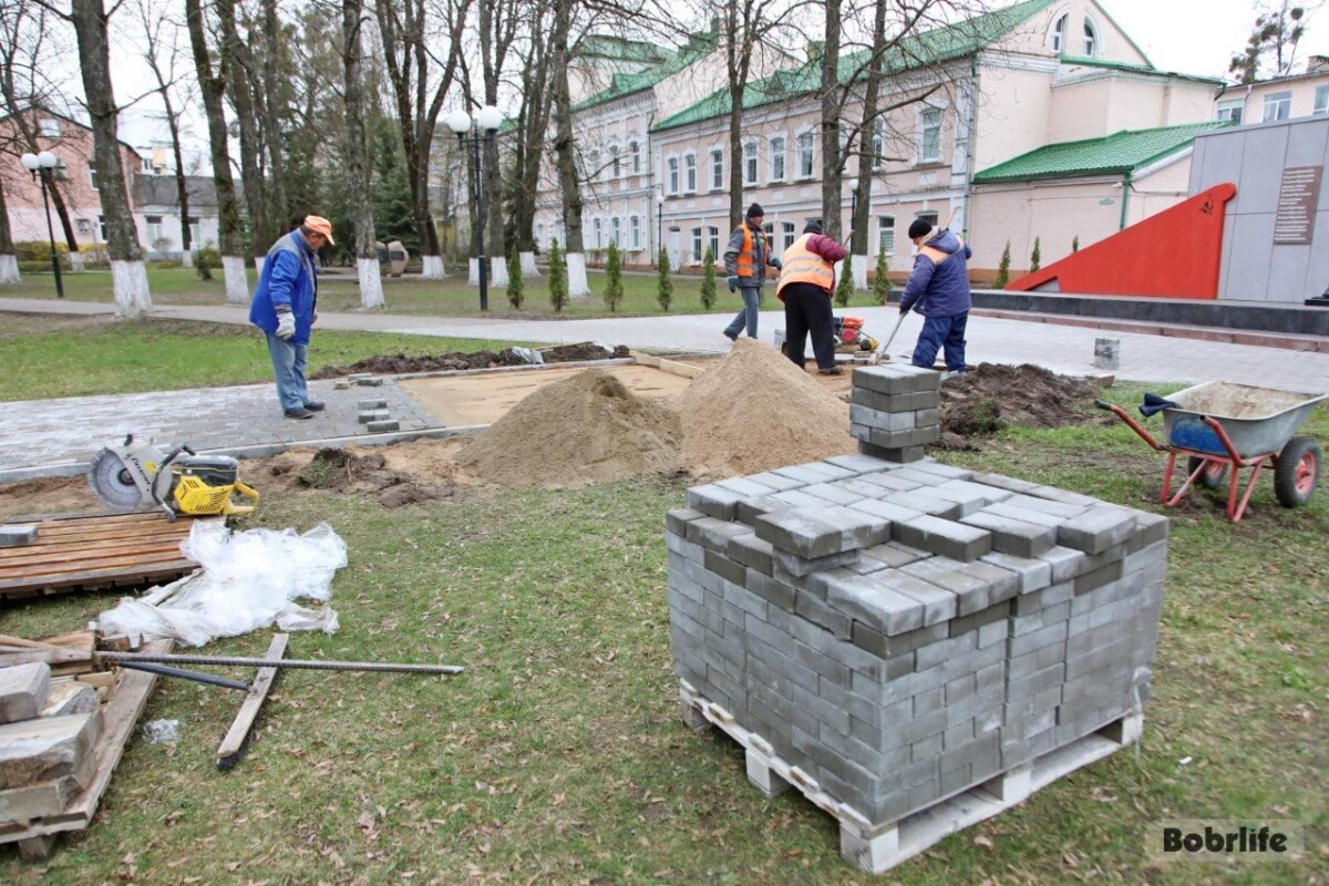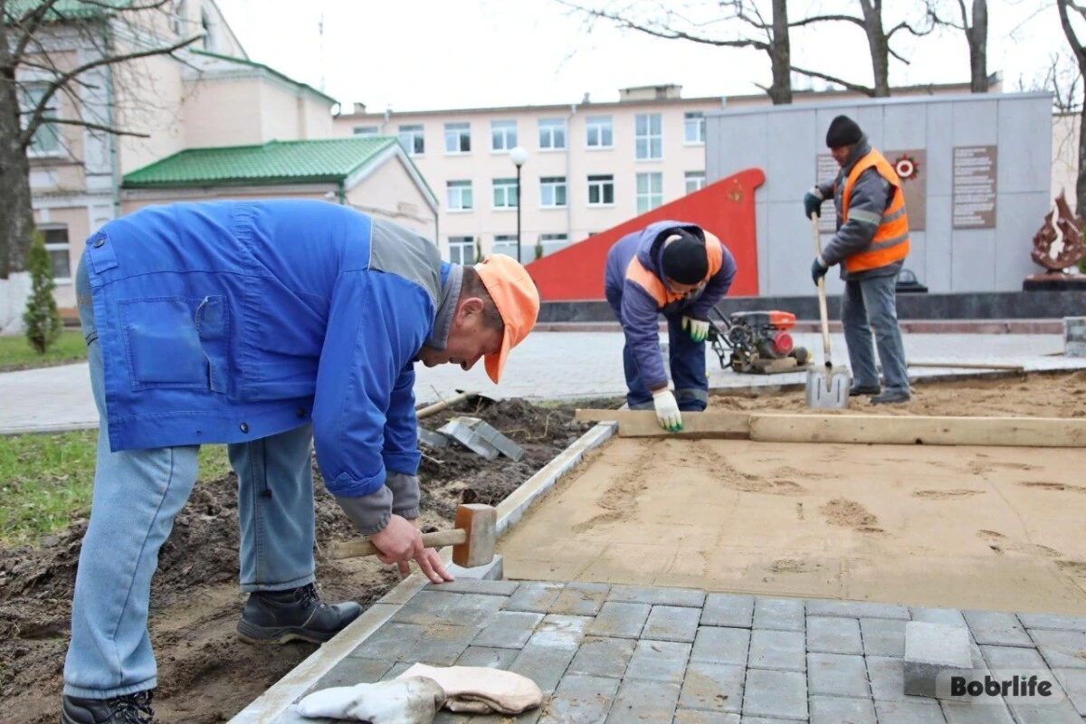 В скверике на подходах к памятнику в честь войсковых частей и соединений, отличившихся при освобождении Бобруйска, на тротуары укладывают современное и удобное покрытие.