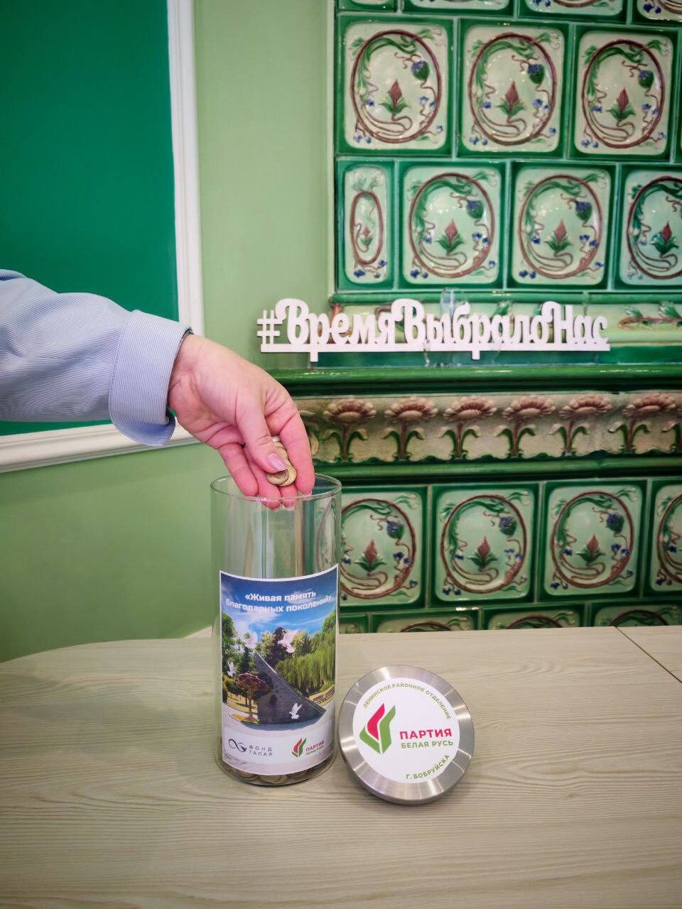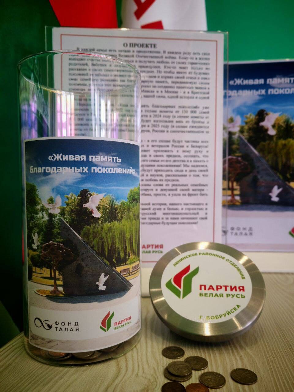 Колба по сбору монет установлена в офисе Ленинского районного отделения Бобруйска Белорусской партии «Белая Русь» по адресу: ул. Пушкина, 211, каб. 1.