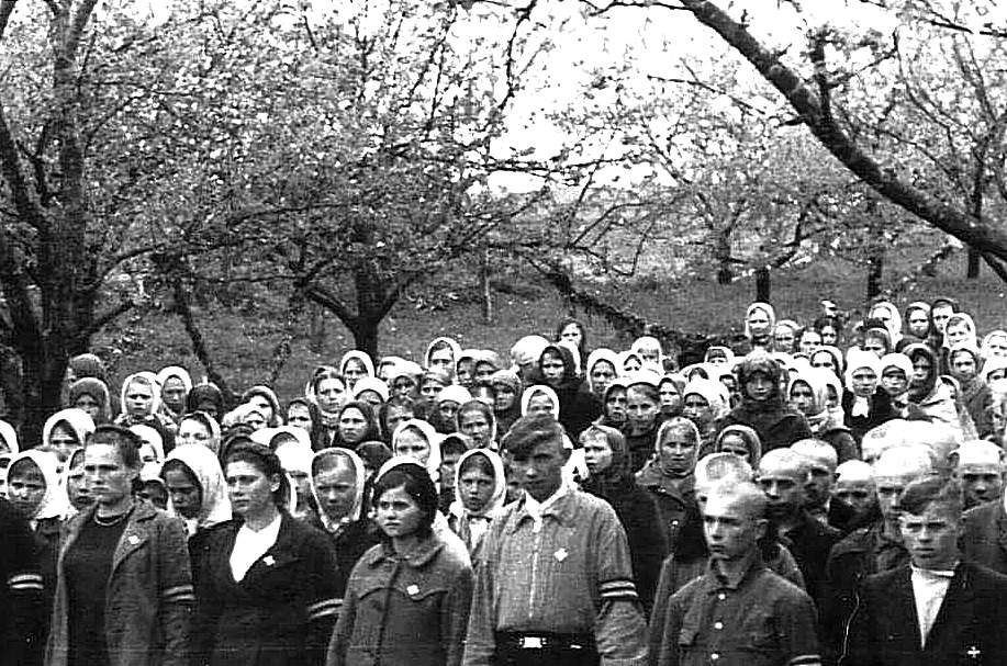 Иван Андреевич Федоринчик 1884 года рождения: «3 июня 1944 года немцы проводили освящение «Юношеского поселения Скобровка»… Говорили по-­немецки, переводчик переводил по-русски. Генерал говорил, что дети привезены из опасных зон, чтобы сохранить их жизнь, чтобы воспитать их в немецком духе, сохранить от большевизма, что большевики издеваются над детьми: 14-летних берут в армию, а 10-летних заставляют рыть окопы. Генерал говорил, что на освящение приглашены родители этих детей, чтобы посмотрели, как они живут. Чтобы убедились, что село проволокой не огорожено, что дети живут свободно. На деле родителей из деревень не было. Съехались служащие и старшины общин, в шляпах, с портфелями и зонтами. Гости пошли на обед, потом разъехались. После угощения гостей дети в течение двух дней были голодными, т.к. продукты были израсходованы…»
