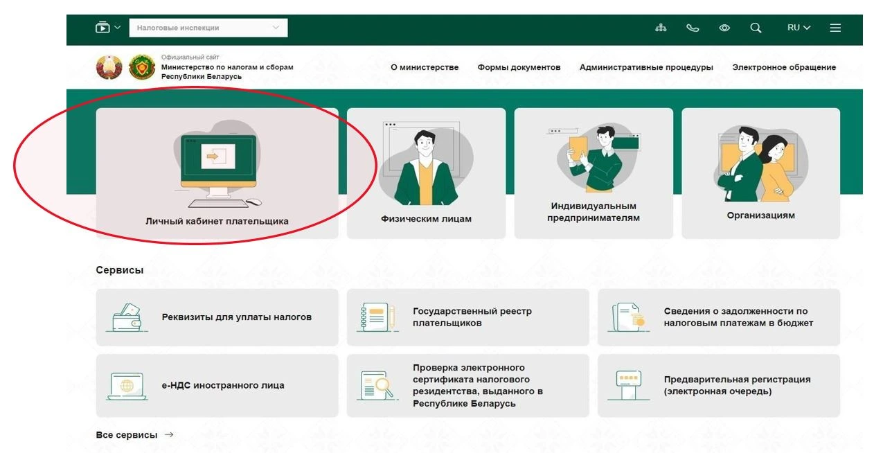 - Ссылка на личный кабинет плательщика расположена на главной странице официального сайта МНС https://nalog.gov.by/.