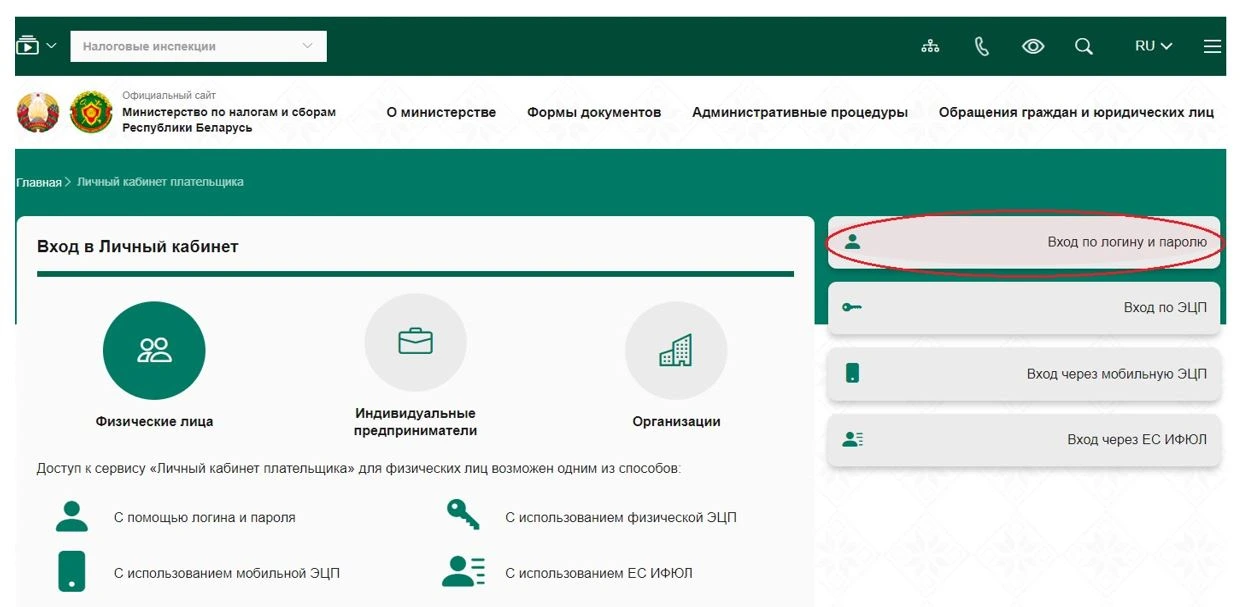 - На открывшейся странице (https://nalog.gov.by/cabinet/) необходимо выбрать способ авторизации «Вход по логину и паролю».