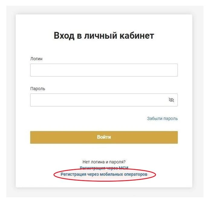 - Для перехода к регистрации через мобильных операторов пользователю необходимо нажать на ссылку «Регистрация через мобильных операторов».