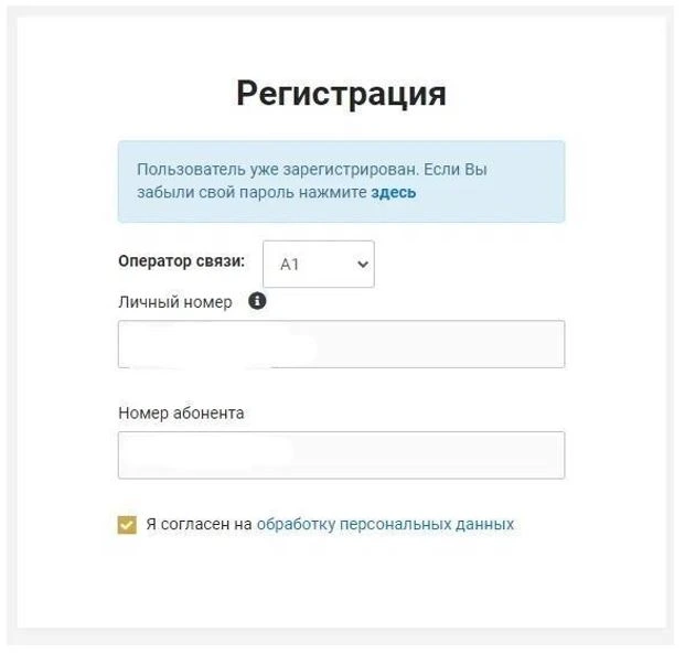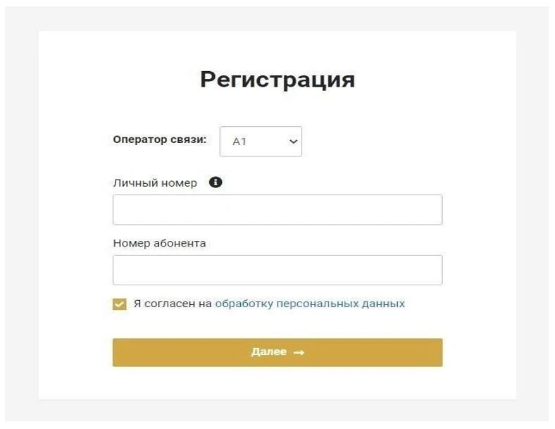 - Для осуществления регистрации на открывшейся странице пользователю необходимо выбрать оператора связи, ввести идентификационный номер документа, удостоверяющего личность (личный номер паспорта гражданина Республики Беларусь, вида на жительство в Республике Беларусь), номер мобильного телефона. Перед нажатием на кнопку «Далее» плательщику в обязательном порядке необходимо ознакомиться с документом «Согласие на обработку персональных данных» и проставить отметку о согласии с данным документом.