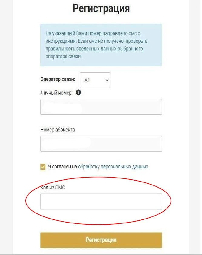В случае соблюдения условия для осуществления регистрации отображается следующее окно с полем для ввода кода из СМС, которое при соблюдении всех требований, должно прийти на номер мобильного телефона, указанный в поле «номер абонента»: