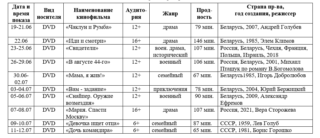 Ко Дню всенародной памяти жертв Великой Отечественной войны и геноцида белорусского народа с 19 июня по 12 июля в видеозале кинотеатра «Мир» покажут военные фильмы. Время показа 16.00.