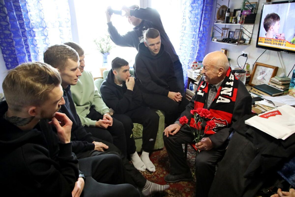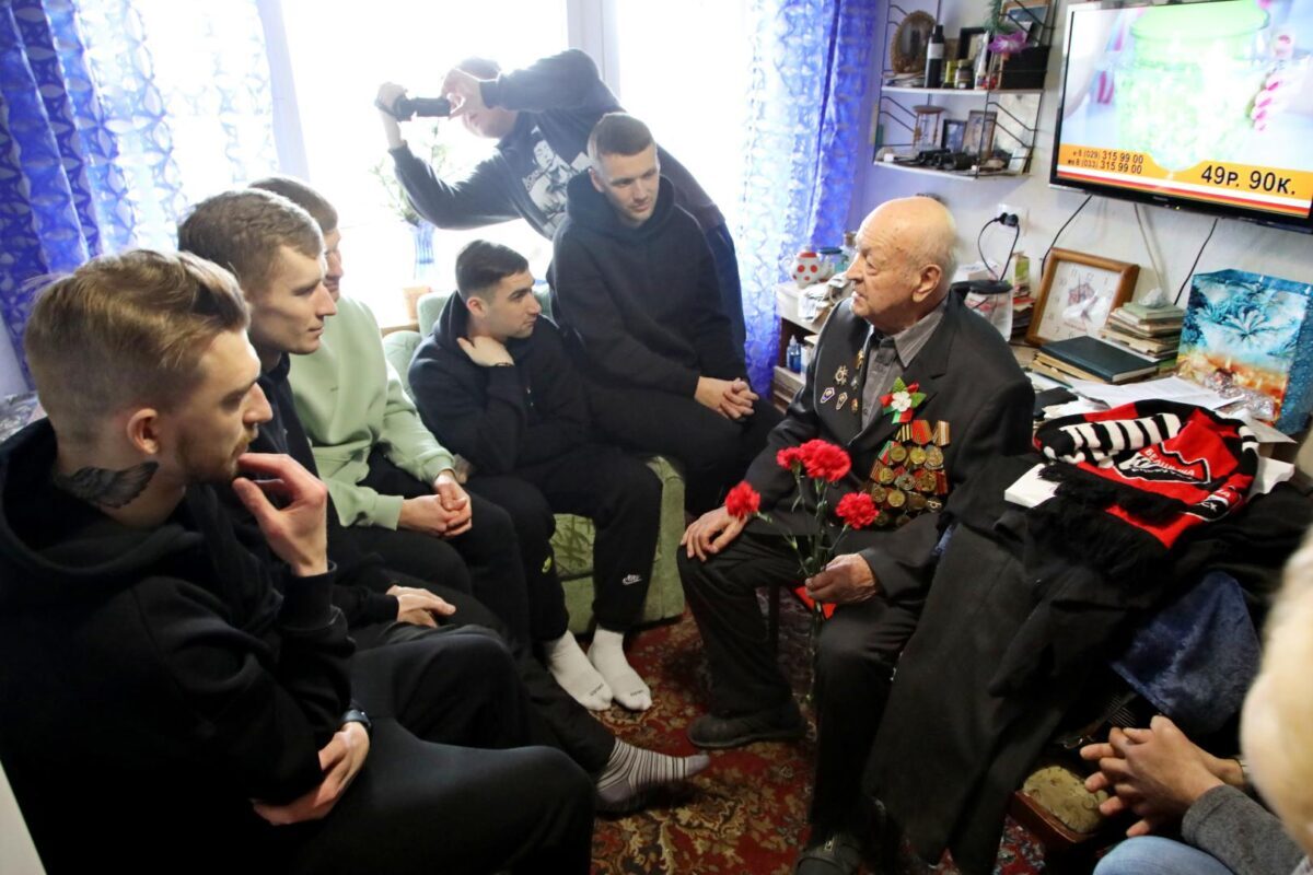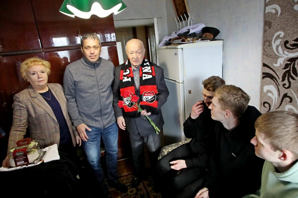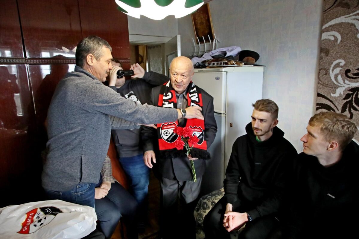 Затем «красно-черные» вместе с председателем городского Совета ветеранов Натальей Коноваловой навестили ветерана Великой Отечественной войны Михаила Волчека. 96-летний Михаил Тимофеевич рассказал интересные факты из своей биографии, о том, как был связным и разведчиком в партизанском отряде, как воевал в составе регулярных войск, как после контузии вернулся домой и в мирное время учился в музыкальном училище, а потом 26 лет работал преподавателем по классу баяна в детской музыкальной школе… Футболисты с интересом задавали вопросы о наградах, о самых трудных минутах на войне и… об увлечениях Михаила Тимофеевича в молодости волейболом и футболом.
