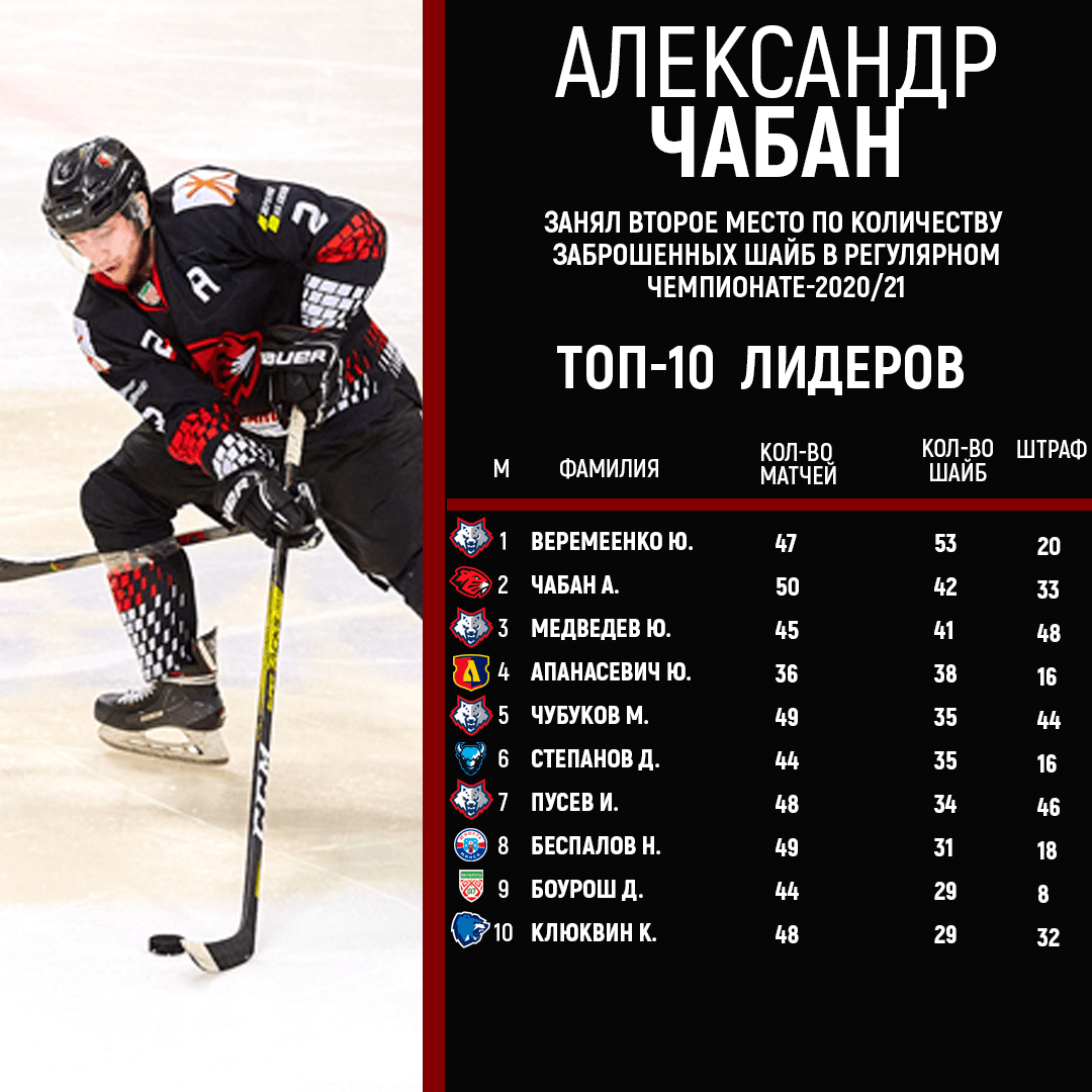 Нападающий хоккейной команды «Бобруйск-2» Александр Чабан занял второе место в рейтинге «лучших снайперов» регулярного чемпионата-2020/21 «Париматч-Высшей лиги».