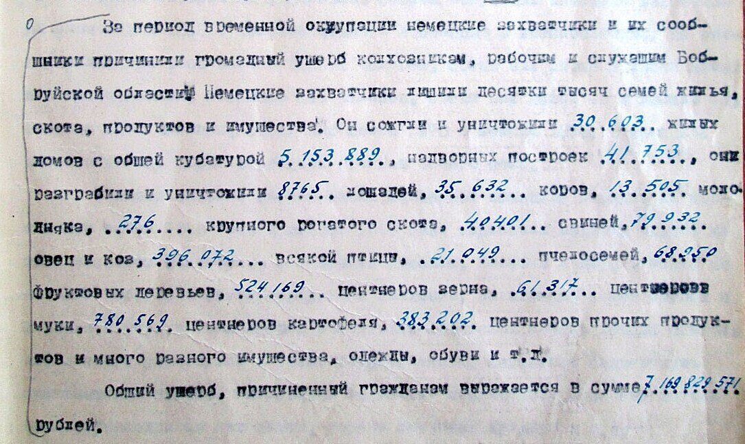 Ущерб, причиненный немецко-фашистскими захватчиками коммунальному хозяйству, народному образованию, городскому здравоохранению и промышленности Бобруйска составил около 485 миллионов рублей. Общий ущерб, причиненный гражданам Бобруйской области, превысил 7 миллиардов рублей (в ценах 1941 г.).