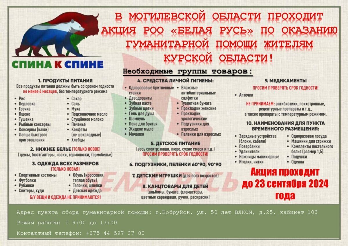 На территории Могилевской области в период со 2 по 23 сентября проходит акция «Спина к спине» по оказанию гуманитарной помощи жителям Курской области.