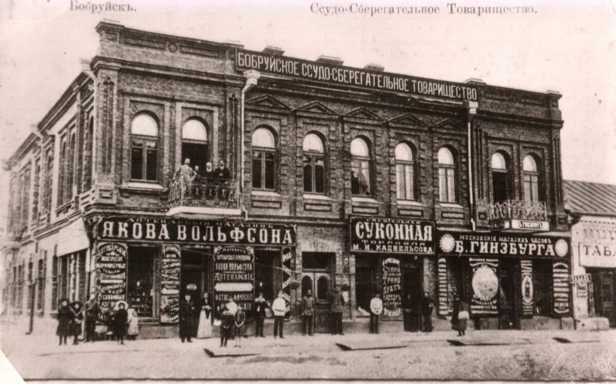 Помещения на первом этаже дома ссудо-сберегательное товарищество сдавало в аренду. Здесь размещался аптекарский магазин Якова Гиршева Вольфсона, который был членом правления товарищества. Служащие магазина предлагали аптекарские и парфюмерные товары, минеральные воды, резиновые и даже фотографические и оптические товары. По соседству под вывеской «Специальная суконная торговля» размещался магазин М.Н. Кацнельсона. Здесь можно было приобрести форменное сукно, трико, драп, кастор и другие ткани. Среди ассортимента товаров для бобруйчан ХХI века ткань под названием кастор звучит как что-то экзотическое. А в прошлом столетии из кастора – плотной шерстяной ткани с коротким ворсом с добавлением бобрового пуха – шили зимние пальто и шляпы, офицерские мундиры и шинели. Как и кастор, большая часть тканей в этом магазине была изготовлена в Западной Европе.