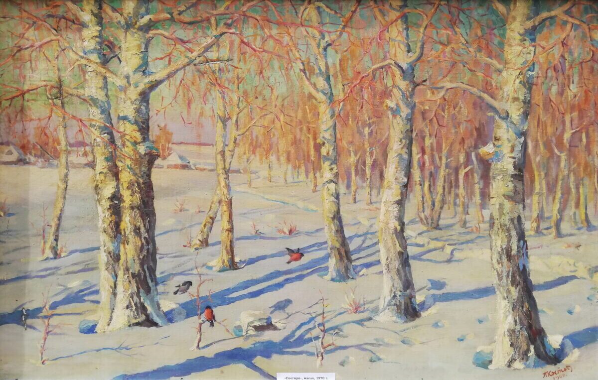 Не менее привлекателен снег в закатном солнце в работе «Снегири», воздух, напоённый багряными лучами, порхающие птицы. Само по себе то, что пейзажи Костко регулярно отмечали на выставках искусствоведы и журналисты, дополнительно свидетельствует о серьёзной базовой подготовке живописца, что мы так же видим на примере множества его работ на выставке в художественном музее.