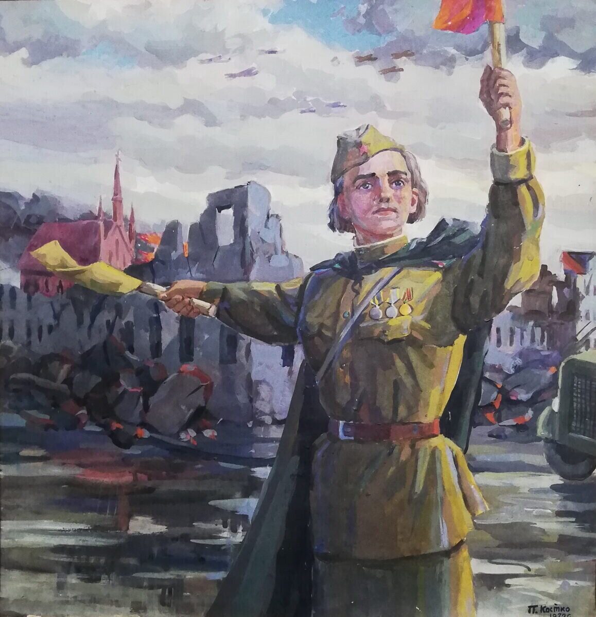 Это удивительно, но Костко прошёл всю войну от начала до конца, участвовал в составе гаубичного артиллерийского полка во многих известных кровопролитных битвах и остался цел, даже не был ранен. А его боевой путь впечатляет: встретил войну в Западной Украине, затем была оборона Киева и Харькова, битва под Ельней, в которой в живых осталось 26 бойцов из 2500 списочного состава полка. Потом были Сталинград и сражение под Прохоровкой и долгий путь освобождения страны. О таких везучих говорят: родился в рубашке. За ратные труды Павел Костко был награждён двумя орденами Красной Звезды и медалями. В войну орден Красной Звезды часто называли «солдатским орденом» и младший состав награждали исключительно за личное мужество и героизм, – замечательная характеристика для нашего героя. А закончил войну в Чехословакии и в сентябре 45-го вернулся домой.Первое время в послевоенном Бобруйске Павел трудился «вольным» художником. Чтобы заработать на жизнь, занимался самой разной, часто около художественной работой. При этом писал этюды, а иногда на заказ – копии с известных картин. Общаться с коллегами было легко, так или иначе все друг друга знали, тем более многие были выпускниками Витебского училища. Художественная жизнь в городе постепенно пробуждалась и, к моменту создания в 1948 году Товарищества художников Бобруйской области, Костко был готов к показу своих работ на выставках. Тогда же в 1948 году (первый документально подтверждённый факт) он принял участие в выставке, организованной Бобруйским областным Домом народного творчества, представил пейзажи акварелью и маслом. Отныне Павел Костко среди наиболее активных участников всех творческих мероприятий. Правда, до первой профессиональной выставки в Бобруйске было ещё три года.Но была и сложность, мешавшая творчеству не только Костко, но практически всех художников послевоенного поколения. После Победы жизнь довелось начинать практически с ноля: создавать семьи, решать жилищные проблемы, поднимать детей, поддерживать престарелых родителей. Художники зарабатывали изготовлением различной агитационной продукции, которая требовалась в больших количествах и неплохо оплачивалась. Это занимало основное время, а на творчество оставались выходные, да и то не все. С момента создания в 1950 году и до самой пенсии Костко трудился в художественно-производственных мастерских Бобруйска. Будучи человеком инициативным, активно участвовал в жизни сообщества художников и в деятельности изостудии при мастерских, выполнял различные общественные нагрузки и функции. Его имя постоянно упоминается в газетных отчётах о выставках с высокой оценкой представляемых произведений.Творчество художника лучше всего открывается на персональной выставке, особенно когда можно увидеть произведения  разных периодов и есть возможность расположить работы в хронологическом порядке. Тогда заметны интересы автора к жанрам и темам, связь с событиями его собственной жизни, увлечения определённой проблематикой, художественными стилями и традициями.Костко довольно редко обращался к сюжетной картине. Сюжеты для его живописных историй, которые мы имеем возможность рассмотреть, достаточно закономерны. Например, виденные им  на фронтовых дорогах регулировщицы. Элегантные девушки в военной форме не могли не оставить впе