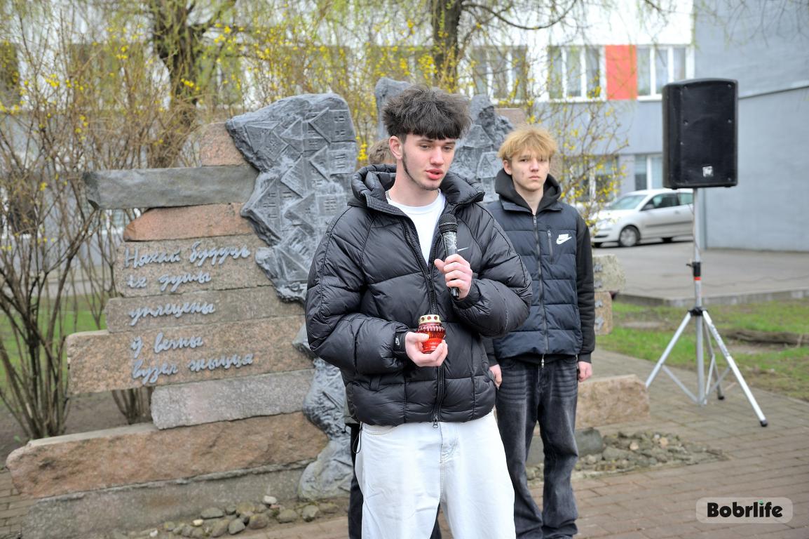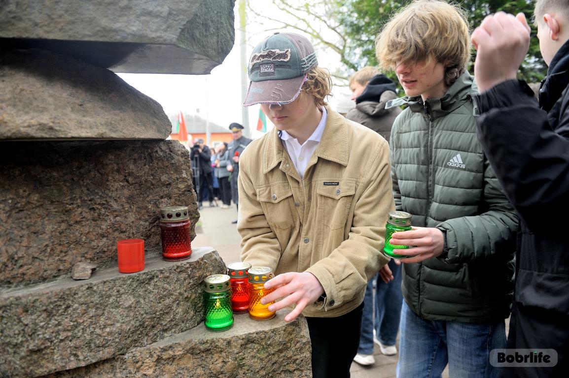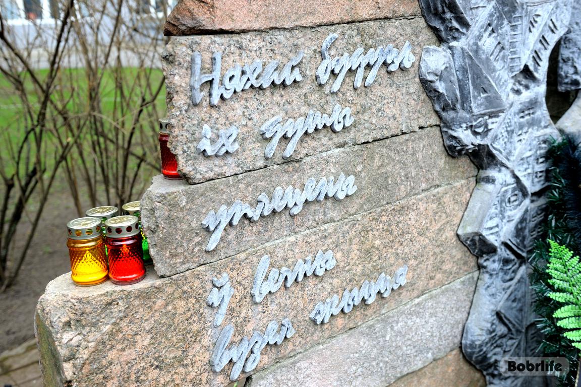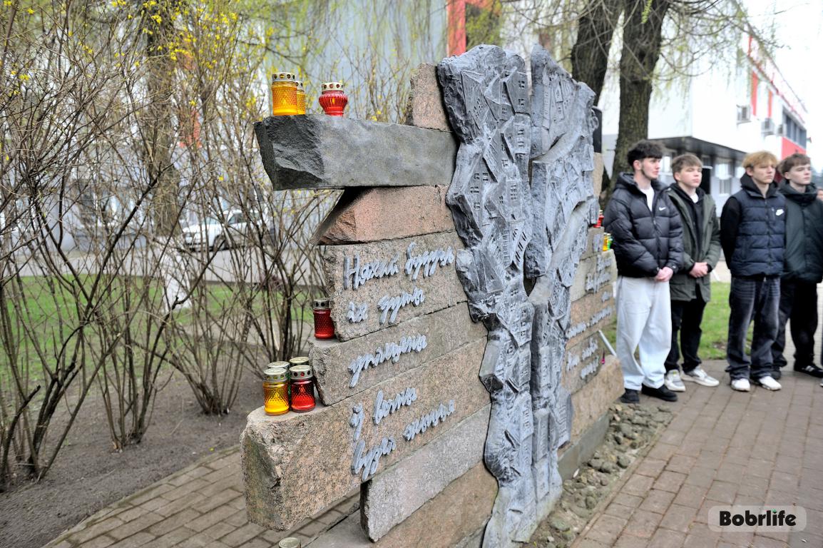 События Великой Отечественной войны стали страшной страницей истории нашего города. Каратели организовали на территории Бобруйской крепости лагерь смерти № 131, устроили в городе гетто, куда согнали все еврейское население Бобруйска, впоследствии зверски уничтоженное в 1941 году возле деревень Каменка и Еловики. В знак глубокой скорби и вечной памяти о безвинно погибших людях, в Международный день освобождения узников фашистских концлагерей неравнодушная молодежь и трудовые коллективы предприятий и организаций нашего города возложили цветы к мемориальному знаку «Узникам Бобруйского гетто». Разделили скорбь с горожанами глава администрации Первомайского района Виталий Власевич, заведующий сектором идеологической работы и по делам молодежи администрации Первомайского района Марта Чичерина, первый секретарь Первомайского РК ОО «БРСМ» Елена Евладова.