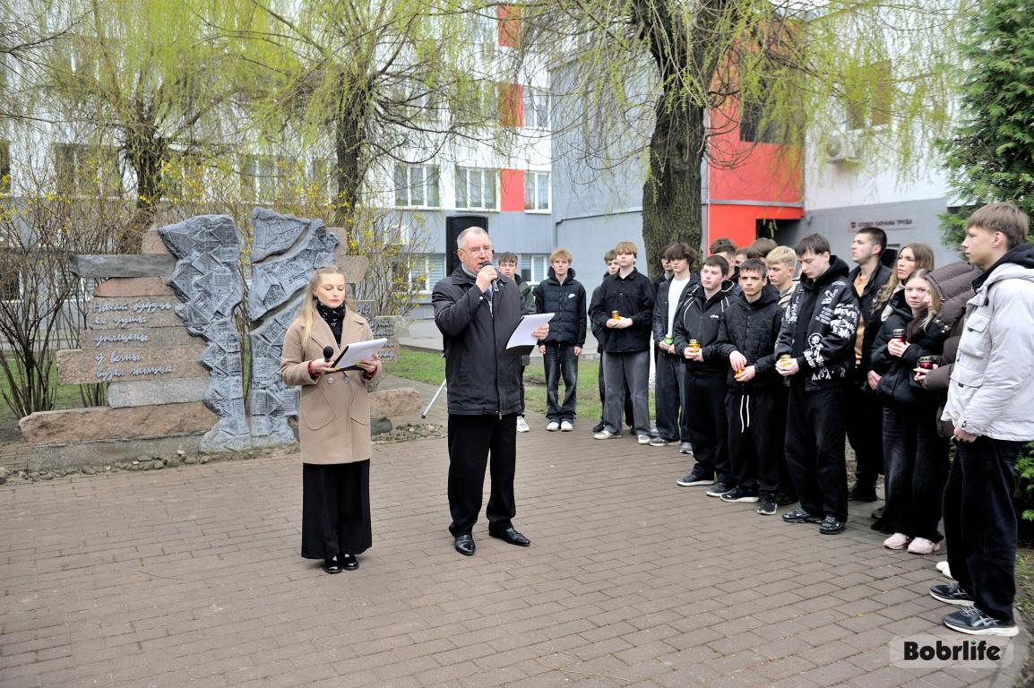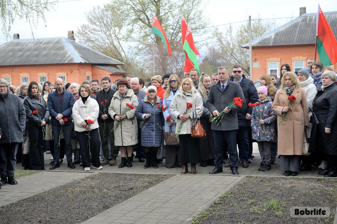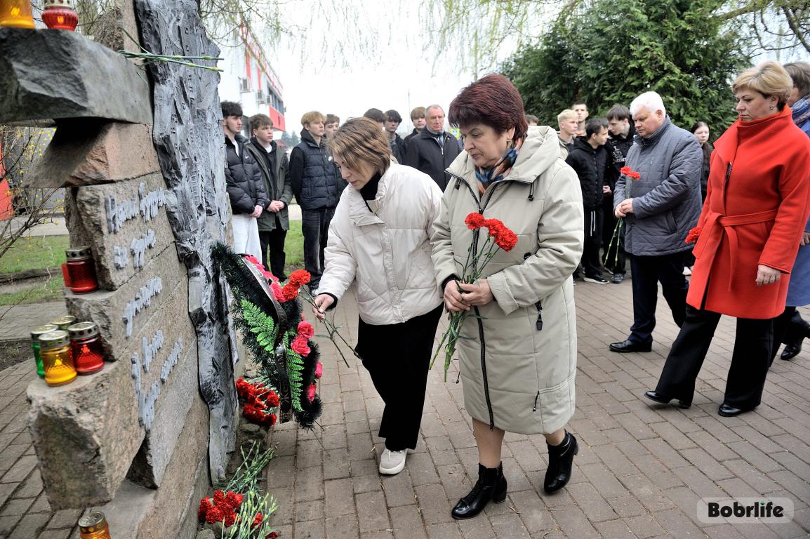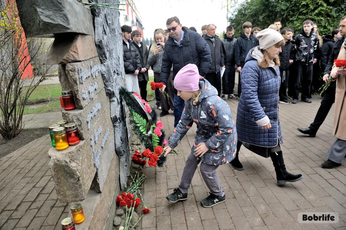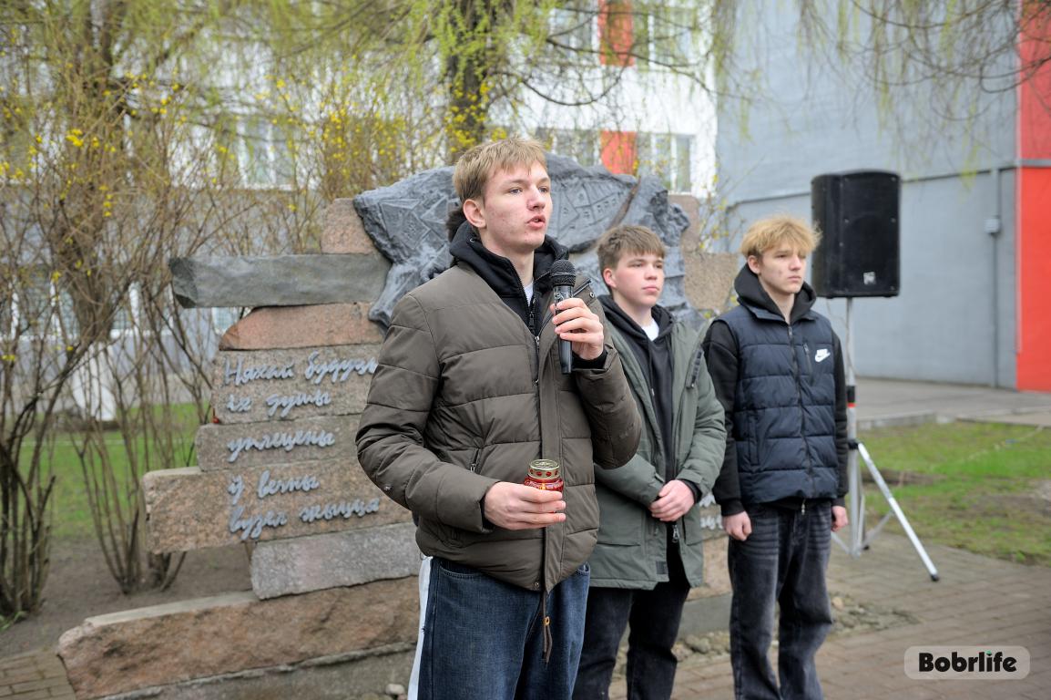 События Великой Отечественной войны стали страшной страницей истории нашего города. Каратели организовали на территории Бобруйской крепости лагерь смерти № 131, устроили в городе гетто, куда согнали все еврейское население Бобруйска, впоследствии зверски уничтоженное в 1941 году возле деревень Каменка и Еловики. В знак глубокой скорби и вечной памяти о безвинно погибших людях, в Международный день освобождения узников фашистских концлагерей неравнодушная молодежь и трудовые коллективы предприятий и организаций нашего города возложили цветы к мемориальному знаку «Узникам Бобруйского гетто». Разделили скорбь с горожанами глава администрации Первомайского района Виталий Власевич, заведующий сектором идеологической работы и по делам молодежи администрации Первомайского района Марта Чичерина, первый секретарь Первомайского РК ОО «БРСМ» Елена Евладова.