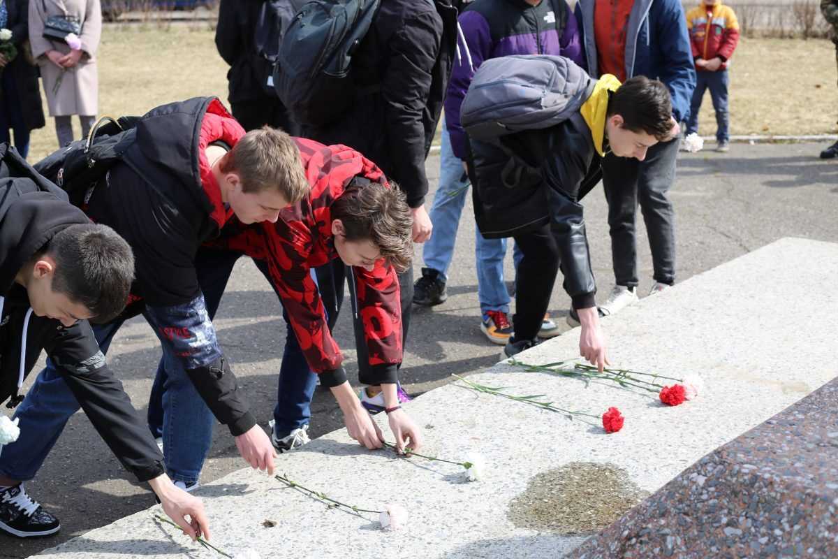 Молодежь и военнослужащие почти память погибших минутой молчания и возложили цветы к памятнику советским воинам-освободителям.