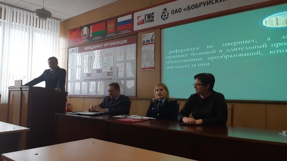 Очередная встреча по обсуждению проекта изменений и дополнений Конституции Республики Беларусь прошла в трудовом коллективе ОАО «Бобруйский машиностроительный завод». Спикерами выступили депутат Палаты представителей Национального собрания Республики Беларусь Владимир Гацко, первый заместитель главы администрации Первомайского района Сергей Лоцкий, заместитель прокурора г.Бобруйска Алла Шестопалова.