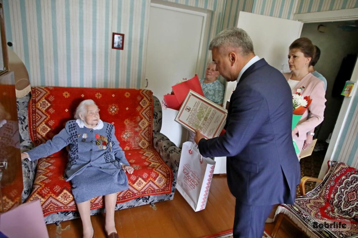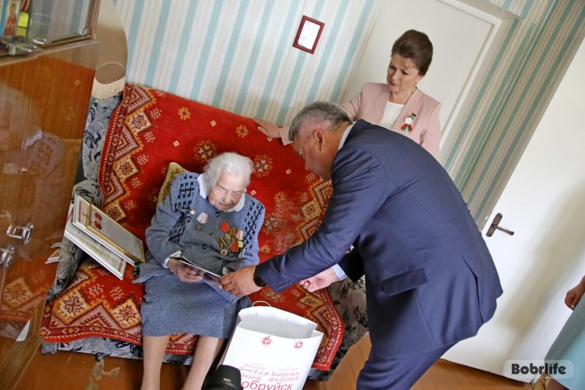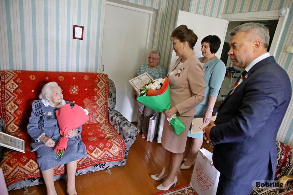 С вековым юбилеем 2 июля поздравляли ветерана Великой Отечественной войны Анастасию Лызо. С пожеланиями, подарками и цветами к Анастасии Андреевне пришли почетные гости – председатель Бобруйского горисполкома Игорь Кисель, председатель Бобруйского городского Совета депутатов Ирина Рынейская, депутат Палаты представителей Национального собрания Республики Беларусь Оксана Приходько, председатель Бобруйской городской организации Белорусского общественного объединения ветеранов Наталья Коновалова.