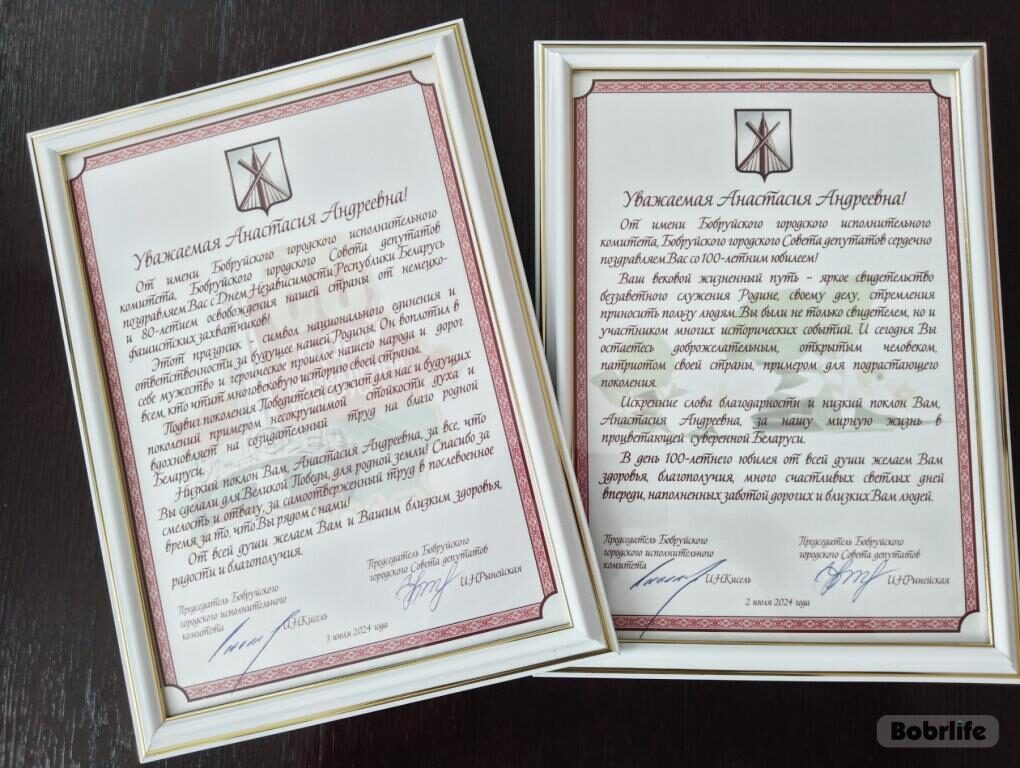 Ветерана искренне поздравили с еще одним важным наступающим праздником – Днем Независимости и 80-летием освобождения Беларуси от немецко-фашистских захватчиков. От горисполкома и горсовета депутатов юбиляру вручили поздравительные адреса с пожеланиями к 100-летию и этой символичной для всей страны дате.