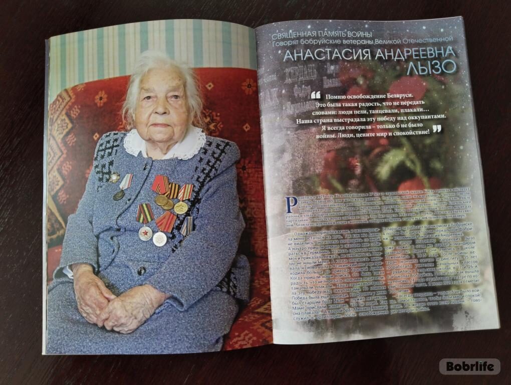 Среди подарков, которые преподнесли гости Анастасии Лызо, памятным и ценным для нее стал альбом «Священная память войны», подготовленный информационным агентством «Бобруйск Медиа». В издании рассказывается о военном и жизненном пути ветеранов нашего города. В начале Великой Отечественной Анастасии Андреевне было 17 лет. Девушка вместе с другими студентами копала противотанковые рвы под Смоленском, потом вернулась домой и в Кличевском районе была связной в партизанском отряде Игната Изоха, прекрасно помнит радость Победы. В мирное время работала учителем начальных классов, воспитала не одно поколение молодежи. «Я всегда твердила – только б не было войны. Самое главное – чтобы были мир и спокойствие. И я желаю этого всем людям», – говорит ветеран Анастасия Лызо.