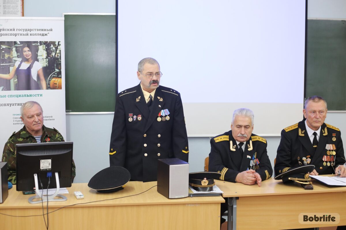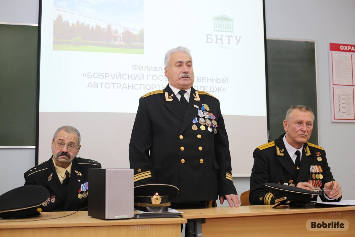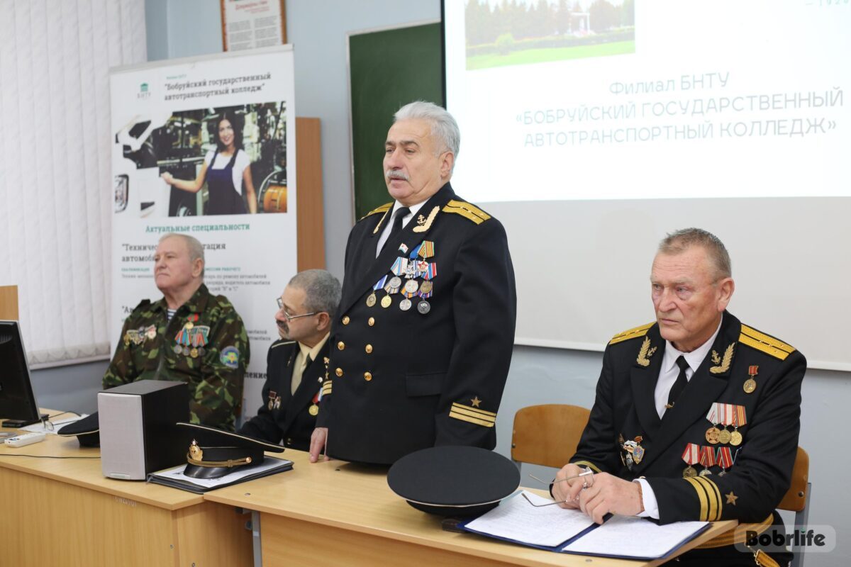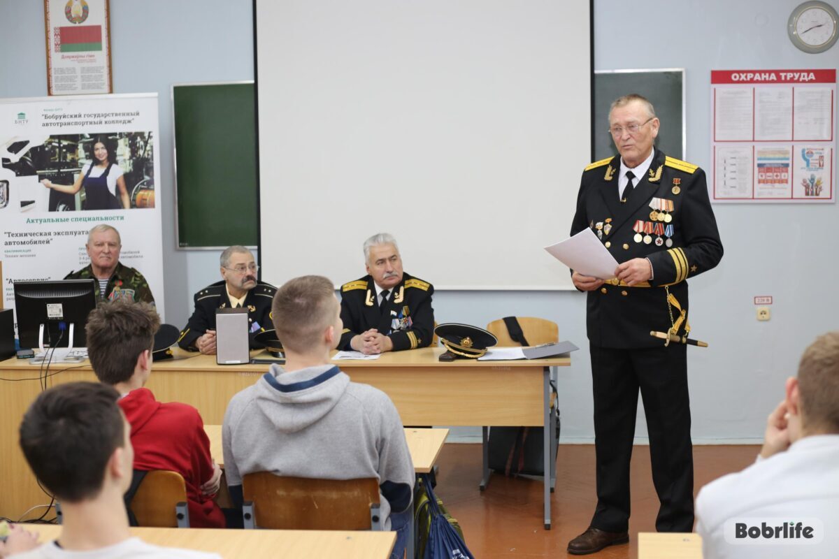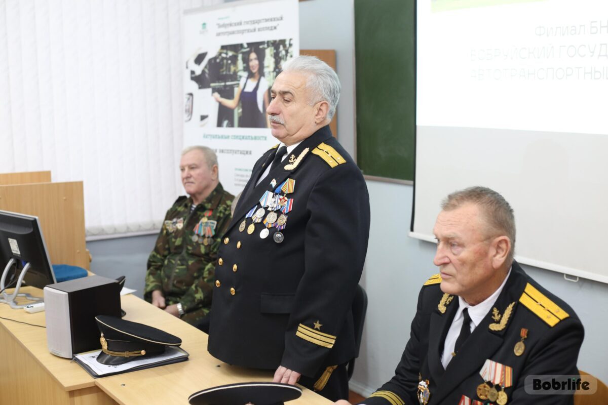 В среду, 28 декабря, на встречу с обучающимися автотранспортного колледжа пришли члены Бобруйской городской организации общественного объединения «Белорусский союз военных моряков» – капитан-лейтенант Сергей Стрельцов, ее председатель, мичман Владимир Майданик, капитан-лейтенант Александр Лепестов, а также Владимир Каковка, ветеран 103-й Витебской отдельной гвардейской воздушно-десантной дивизии.